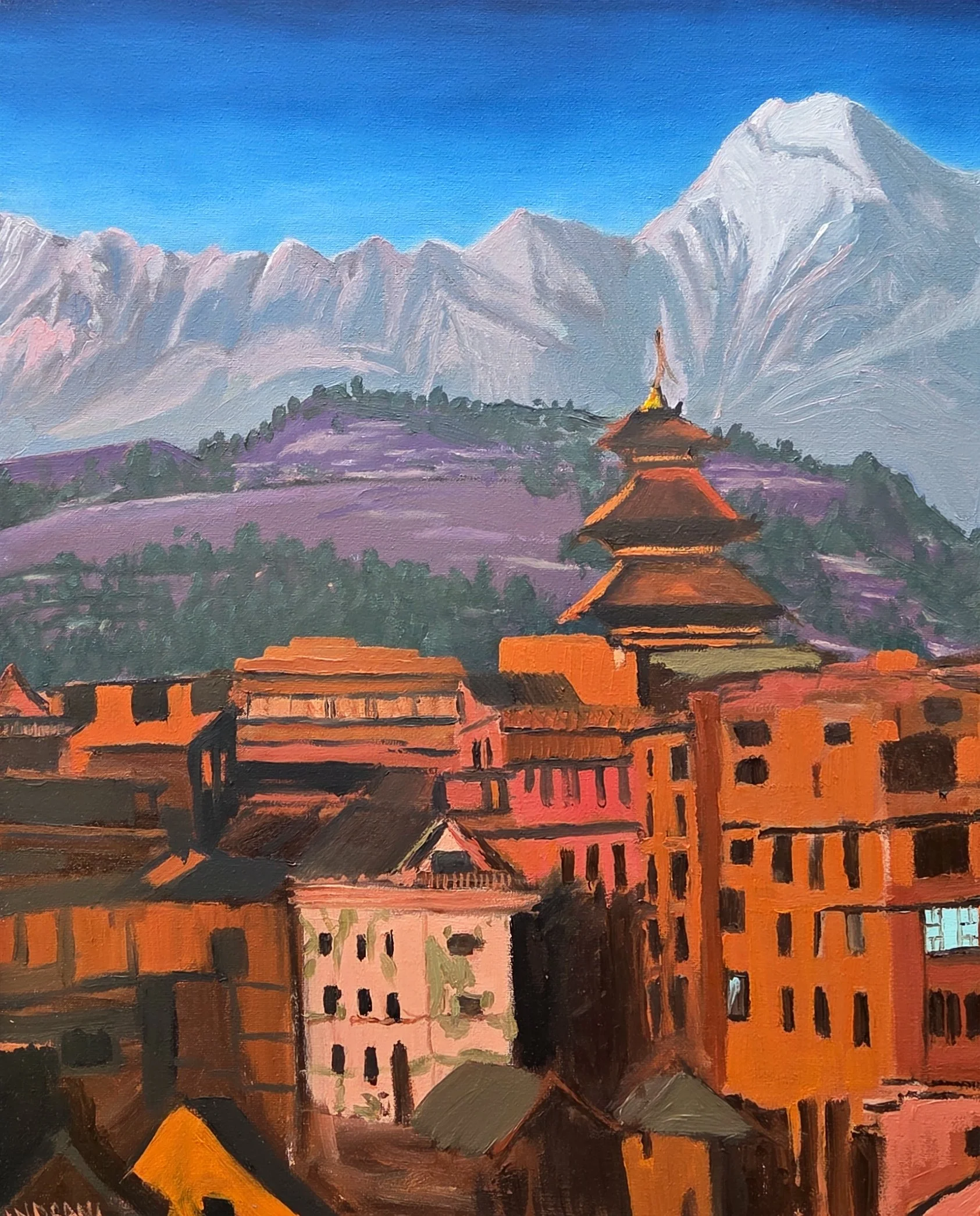 Inspired by the breathtaking contrast of the Himalayan snow peaks and terracotta cityscapes of Nepal. A study of landscape atmospheric perspective. Oil on canvas 40X50cm