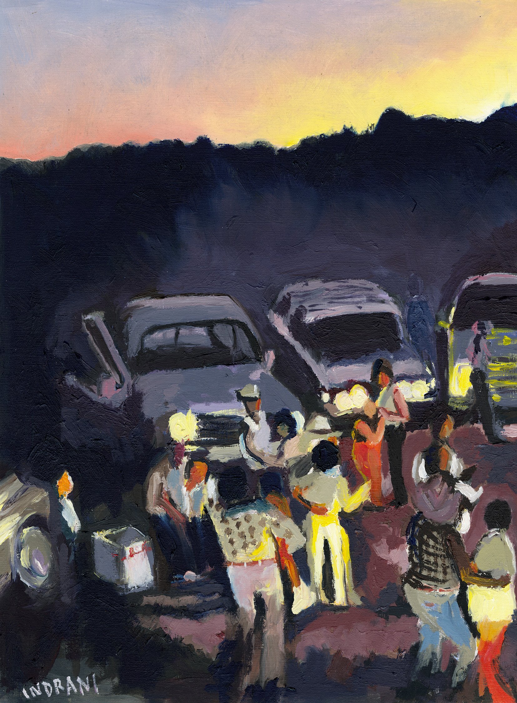 An exercise in dark and light. My favourite thing about painting this scene was the mood - hopeful, wistful, positive. Children up late. People dancing, mingling and feeling good. The stuff of dreams really. A Tailgate Party - oil on paper 30X40cm 2024. SOLD. Limited edition prints still available.